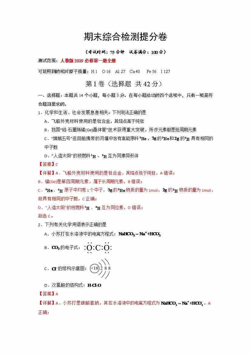 期末综合检测提分卷(测试范围:第1章至第4章)-(人教版2019必修第一册)(教师版)