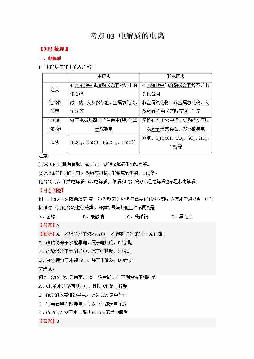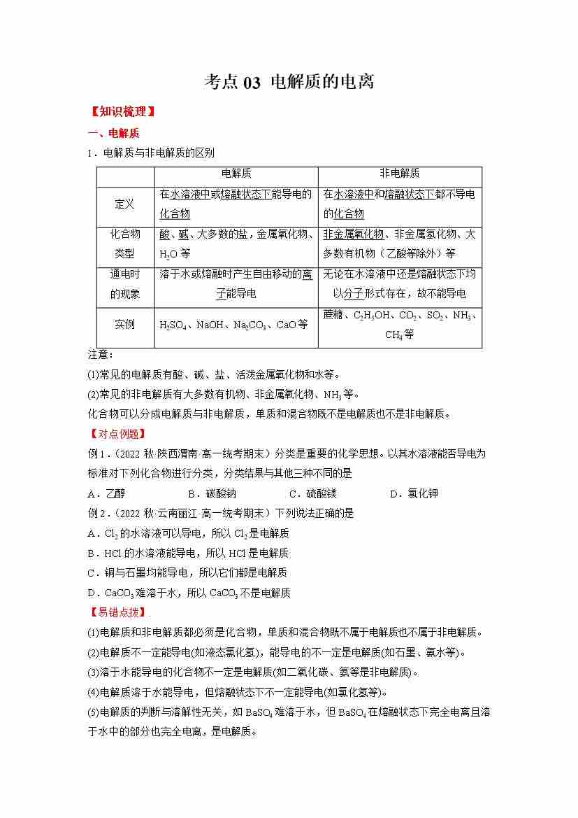 考点03 电解质的电离(学生版)