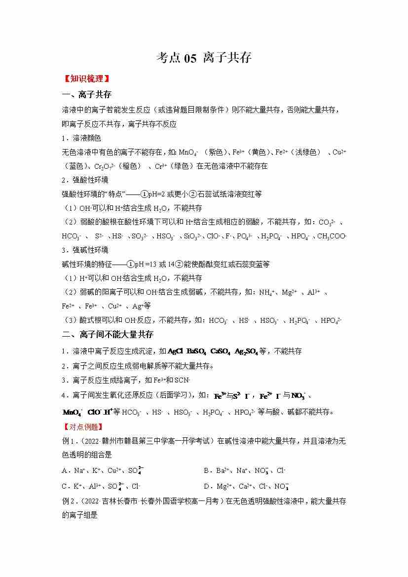 考点05 离子共存(学生版)