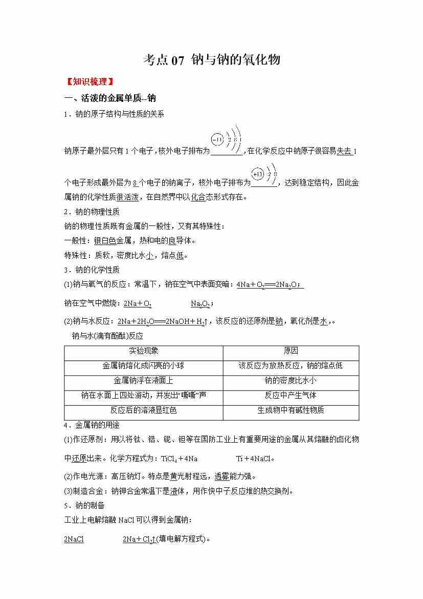 考点07 钠与钠的氧化物(学生版)