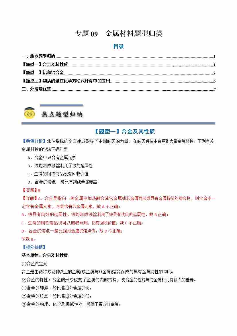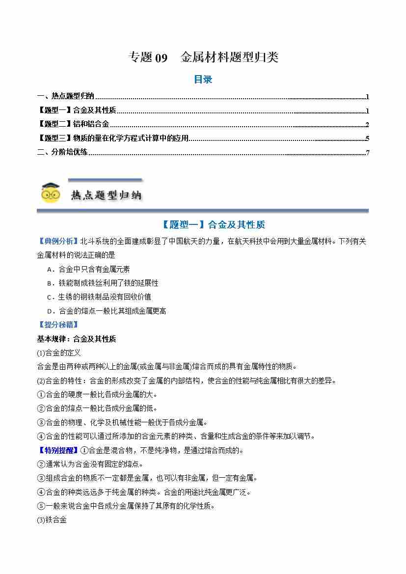 专题09 金属材料-(人教版2019必修第一册)(学生版)