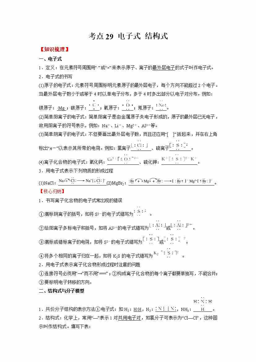 考点29 电子式 结构式-(学生版)