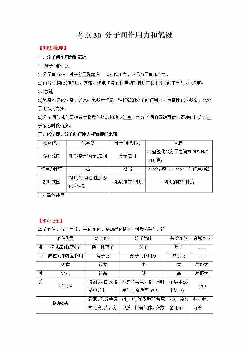 考点30 分子间作用力和氢键-(教师版)