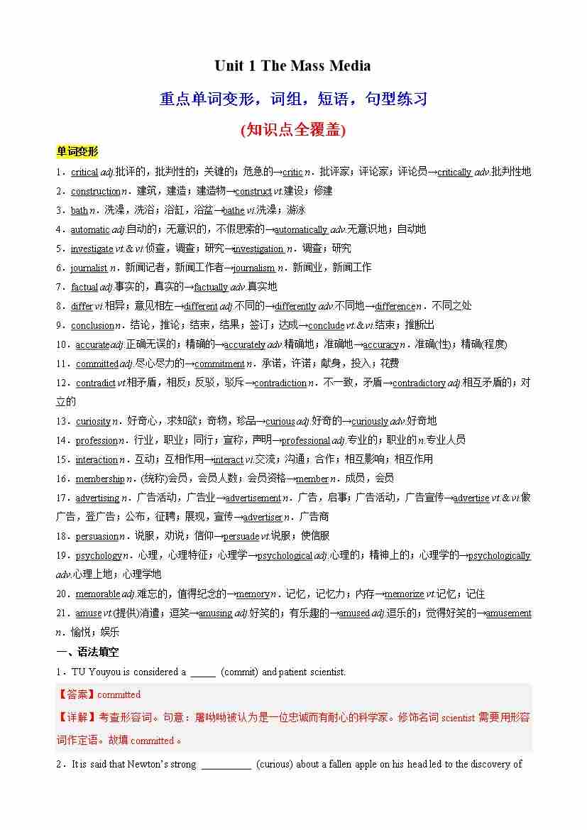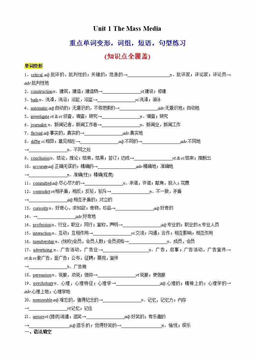 Unit 1 The Mass Media词性转换,核心单词,语法,短语,知识点复习题(教师版)