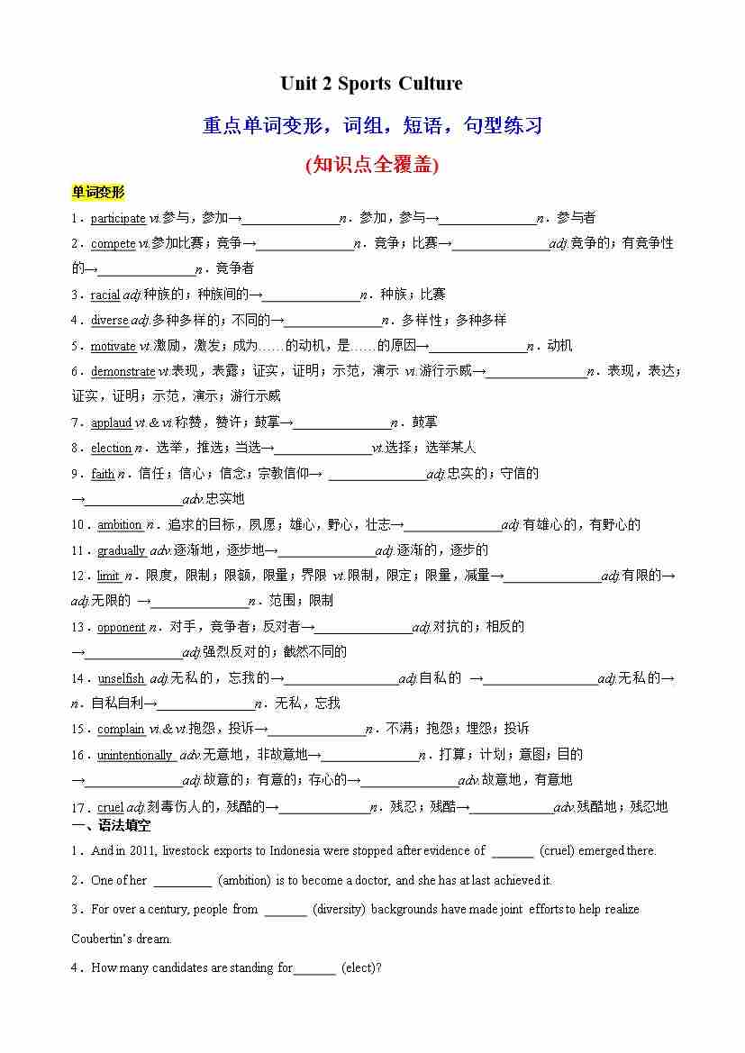 Unit 2 Sports Culture词性转换,核心单词,语法,短语,知识点复习题(学生版)