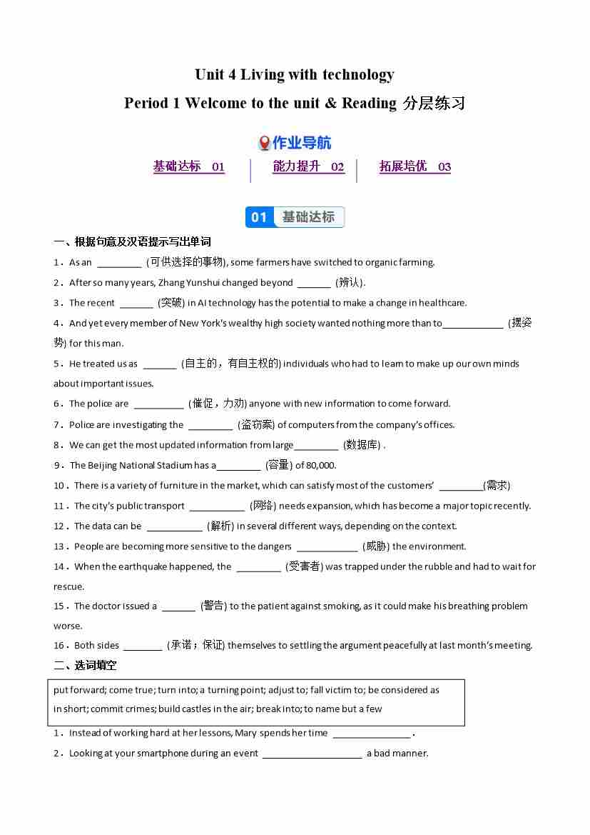 Unit 4 Period 1 Welcome to the unit & Reading(分层作业) 选择必修第二册(原卷版)