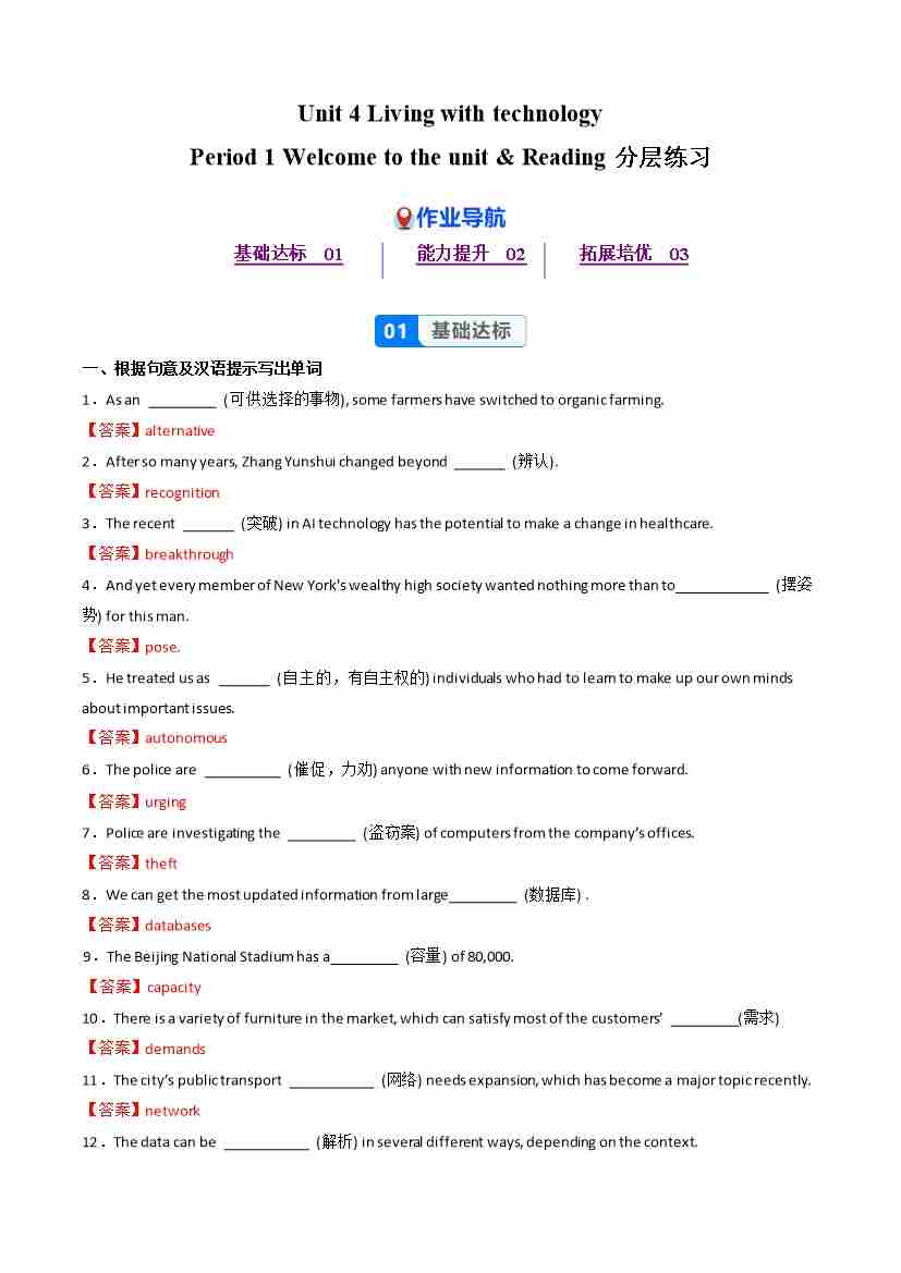 Unit 4 Period 1 Welcome to the unit & Reading(分层作业) 选择必修第二册(解析版)