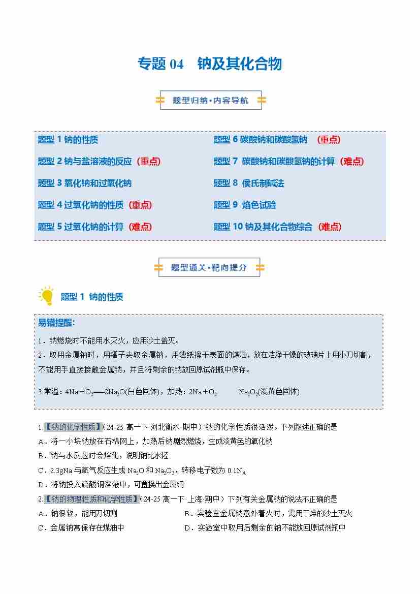 专题04 钠及其化合物(期中专项训练)(学生版)