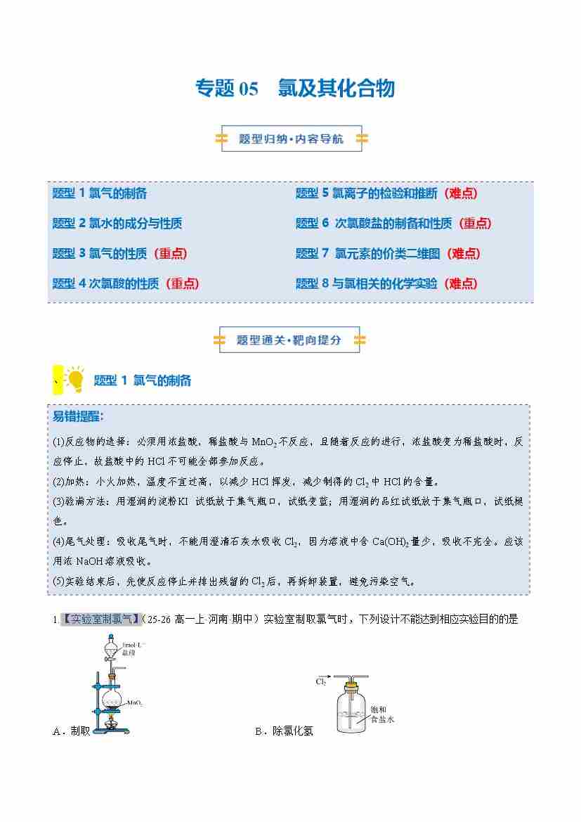 专题05 氯及其化合物 (期中专项训练)(学生版)