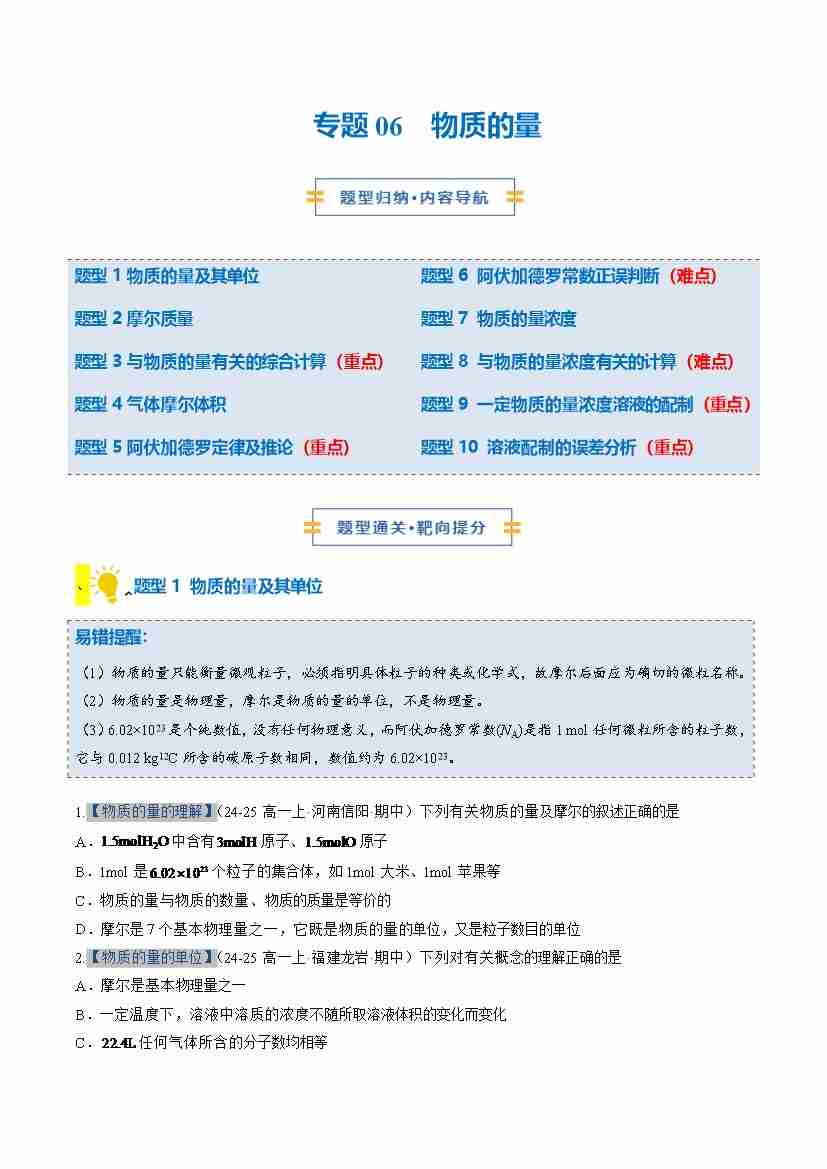 专题06 物质的量 (期中专项训练)(学生版)