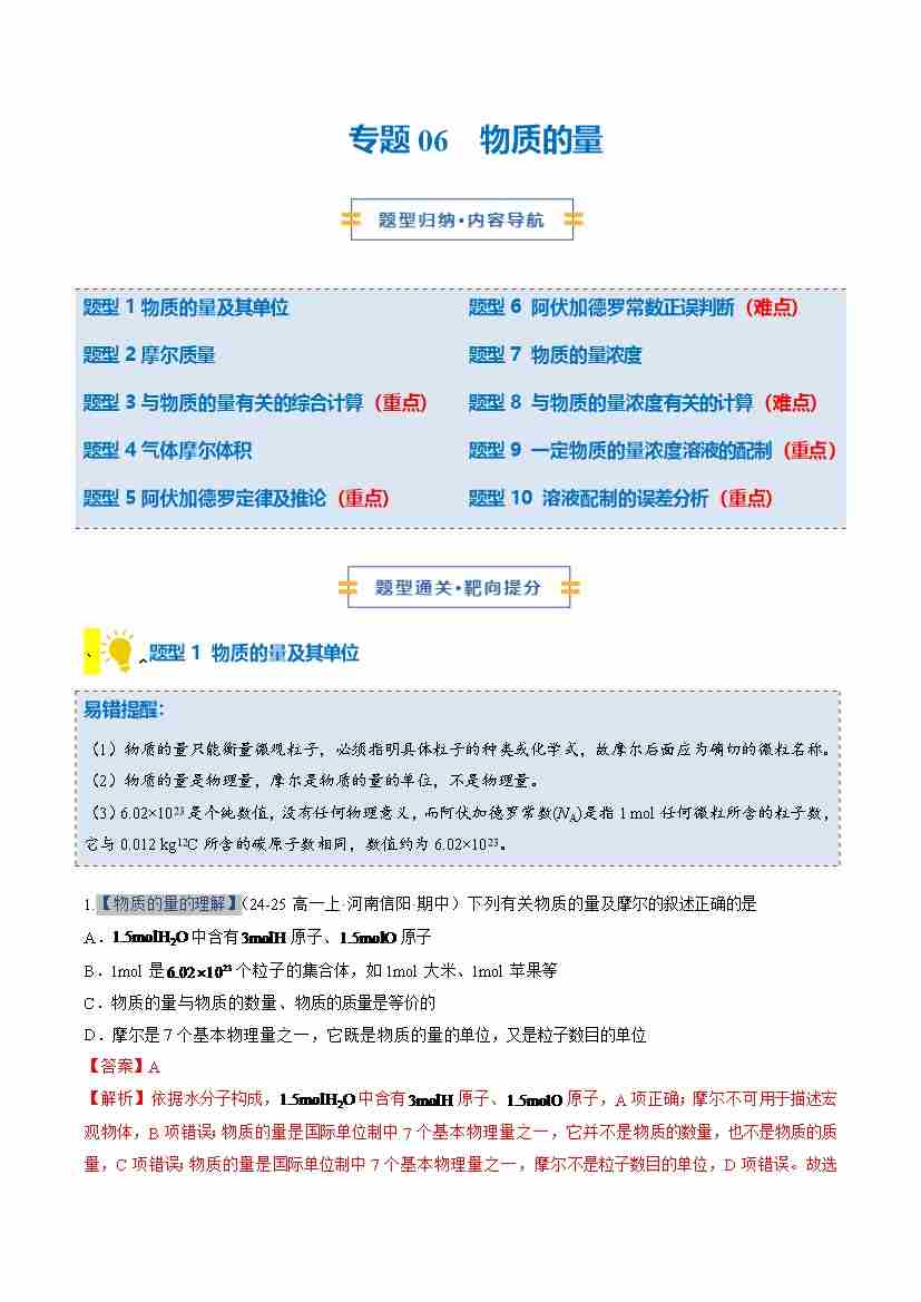 专题06 物质的量 (期中专项训练)(教师版)