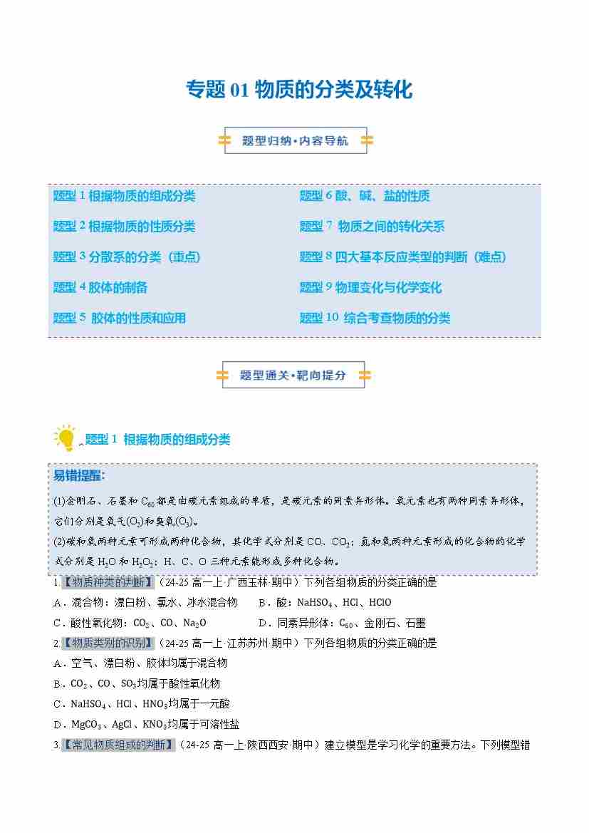 专题01物质的分类及转化 (期中专项训练)(学生版)