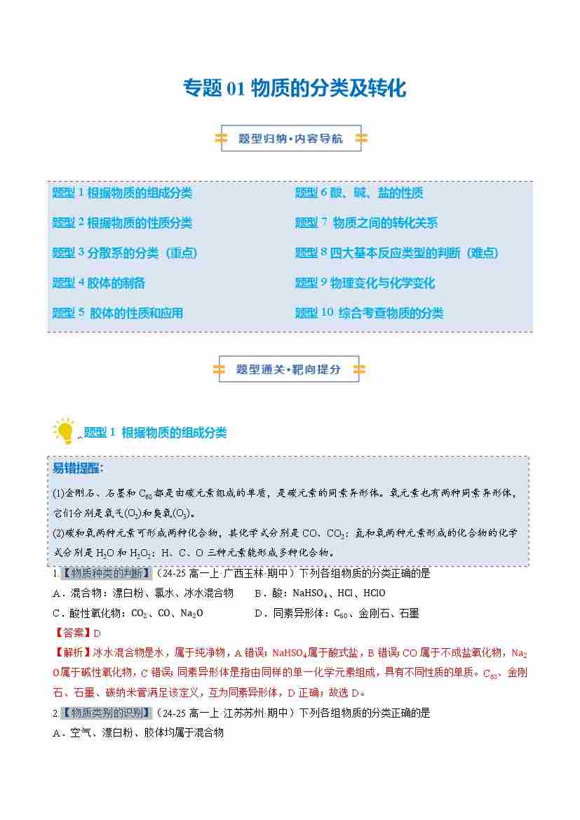 专题01物质的分类及转化 (期中专项训练)(教师版)