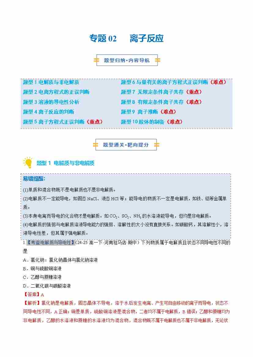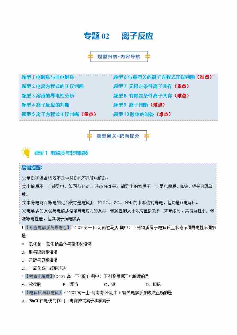 专题02 离子反应 (期中专项训练)(学生版)