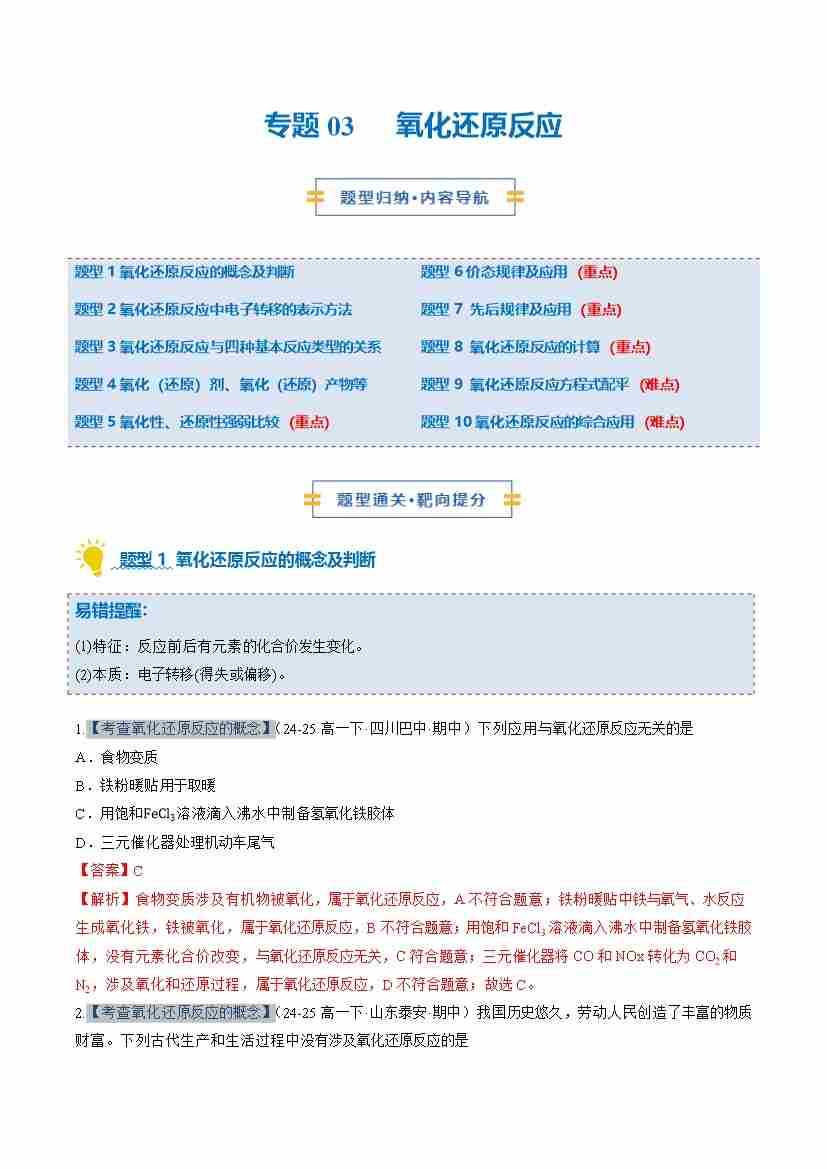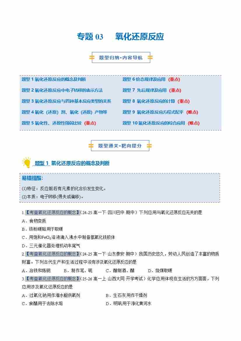 专题03 氧化还原反应(期中专项训练)(学生版)