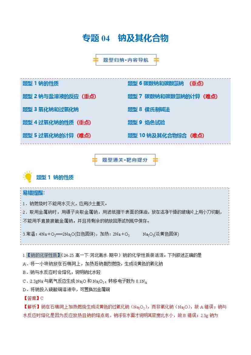 专题04 钠及其化合物(期中专项训练)(教师版)