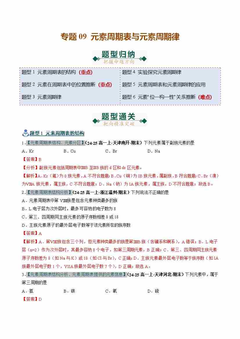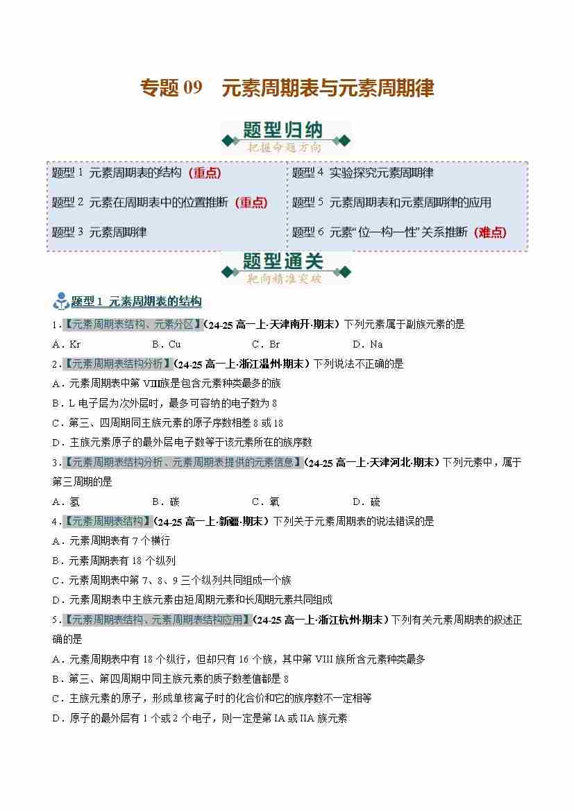 专题09 元素周期表与元素周期律(期末复习专项训练)(原卷版)