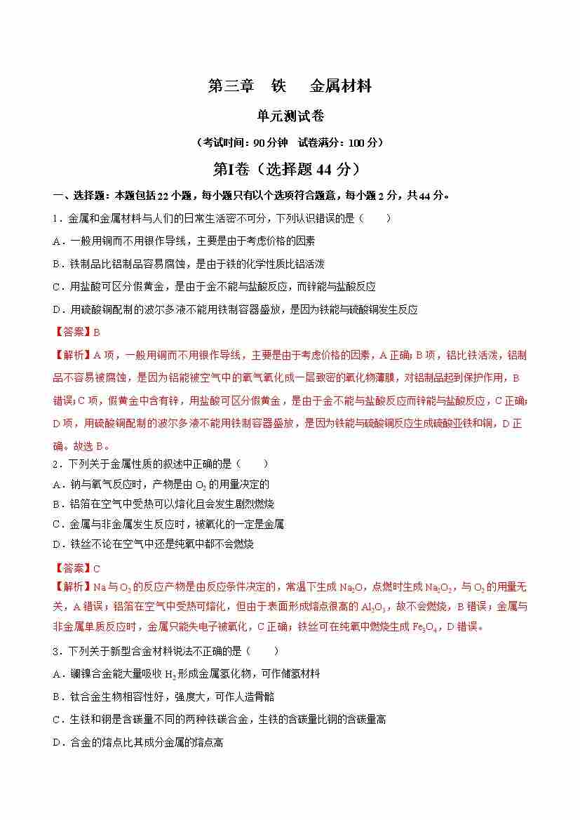 第三章 铁 金属材料(单元测试)(解析版)