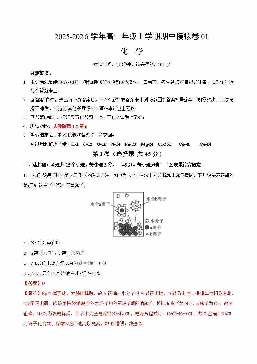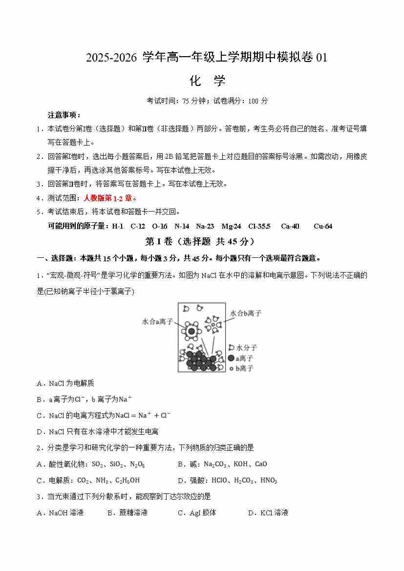 高一化学上学期期中模拟卷01(人教版2019)(考试版A4)