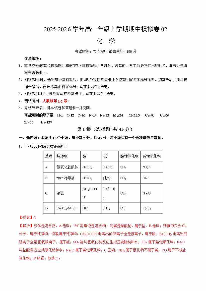 高一年级化学上学期期中模拟卷02(人教版2019)(全解全析)