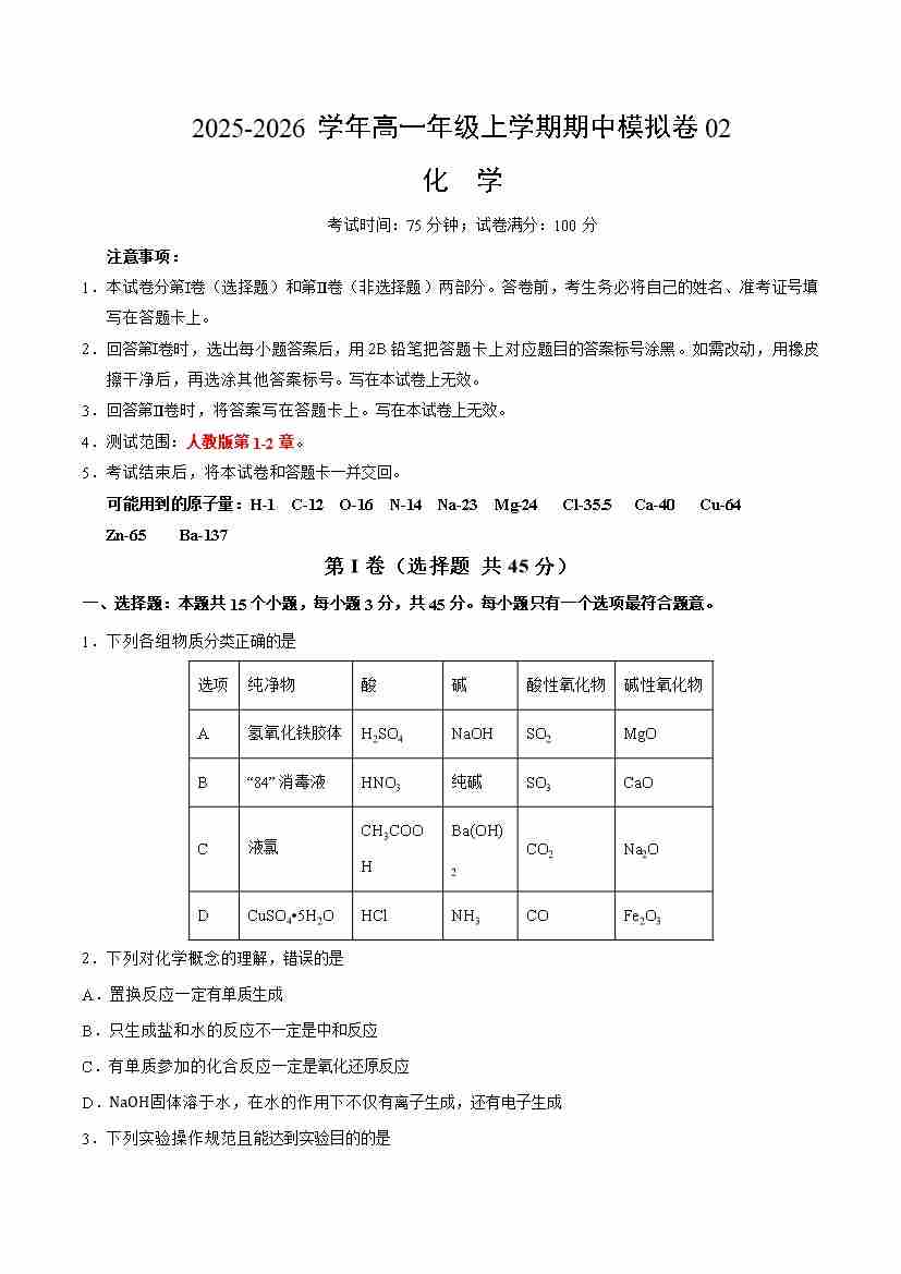 高一年级化学上学期期中模拟卷02(人教版2019)(考试版A4)