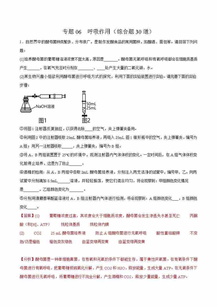 专题06 呼吸作用(综合题30道)(教师版)