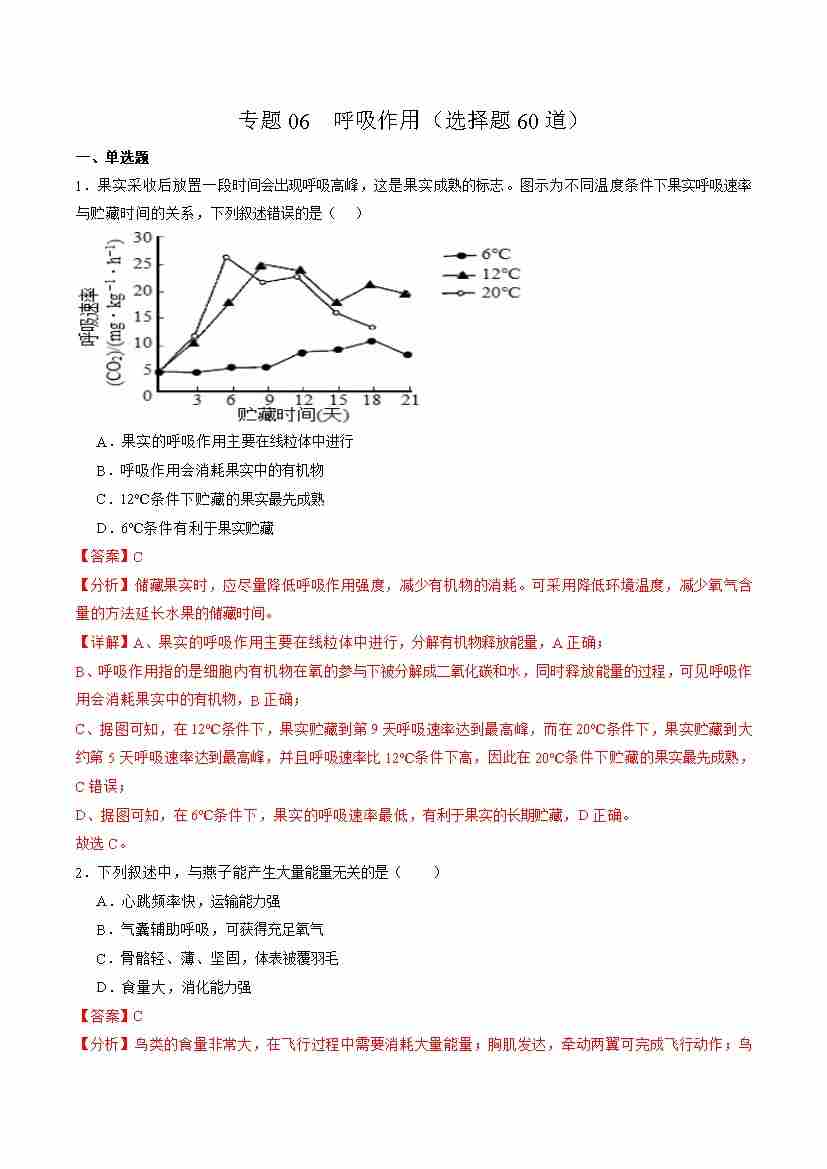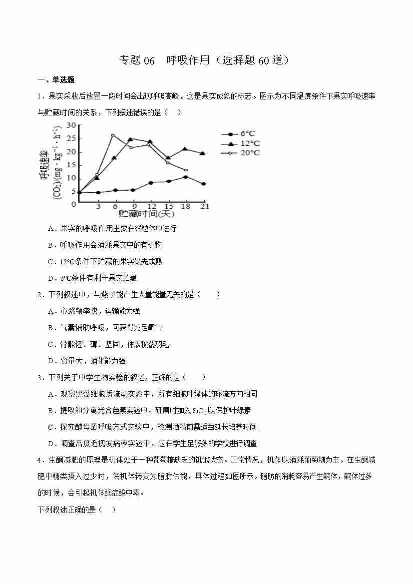 专题06 呼吸作用(选择题60道)(学生版)