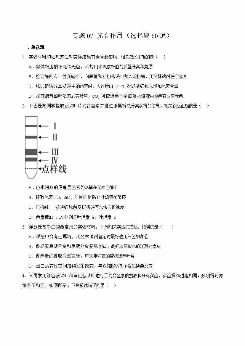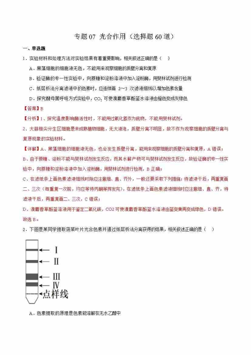 专题07 光合作用(选择题60道)(教师版)