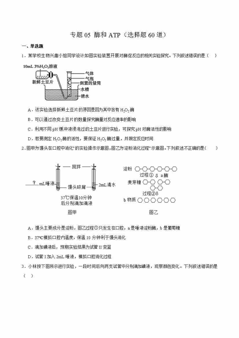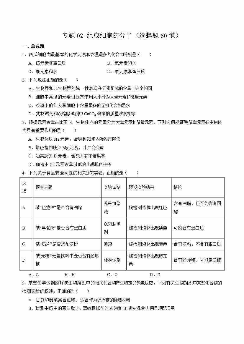 专题02 组成细胞的分子(选择题60道)(学生版)