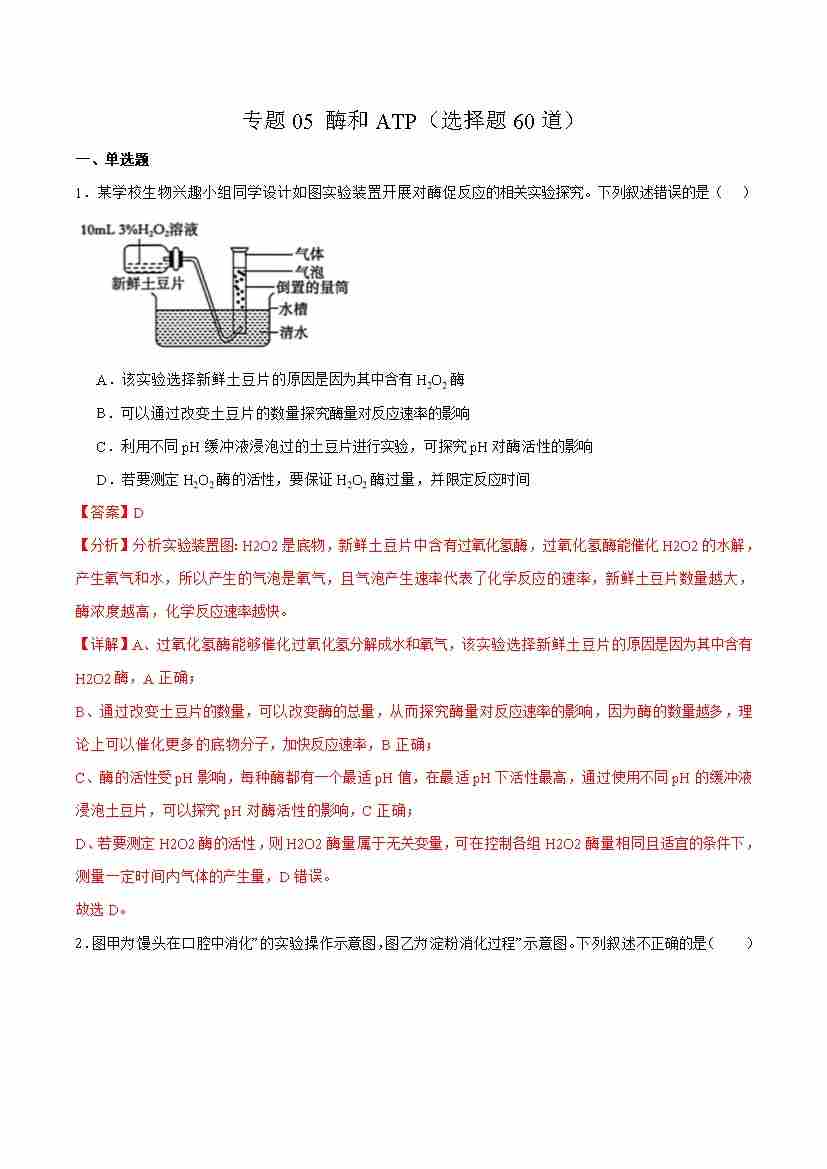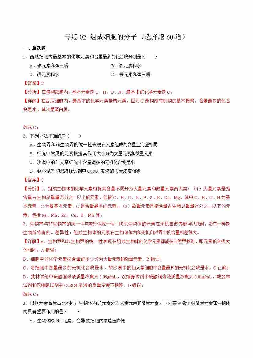 专题02 组成细胞的分子(选择题60道)(教师版)