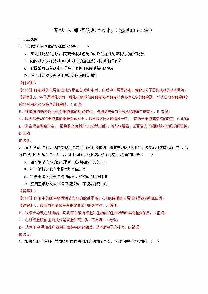 专题03 细胞的基本结构(选择题60道)(教师版)