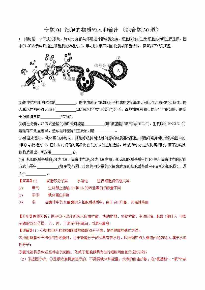 专题04 细胞的物质输入和输出(综合题30道)(教师版)