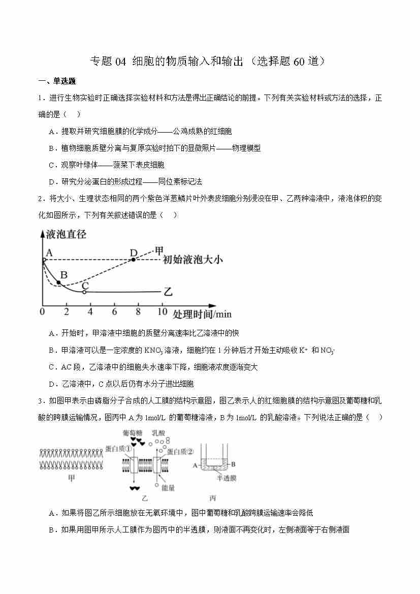 专题04 细胞的物质输入和输出(选择题60道)(学生版)