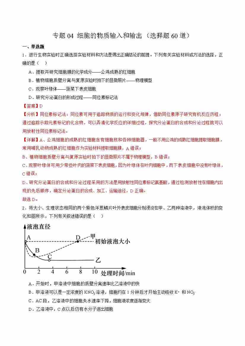 专题04 细胞的物质输入和输出(选择题60道)(教师版)