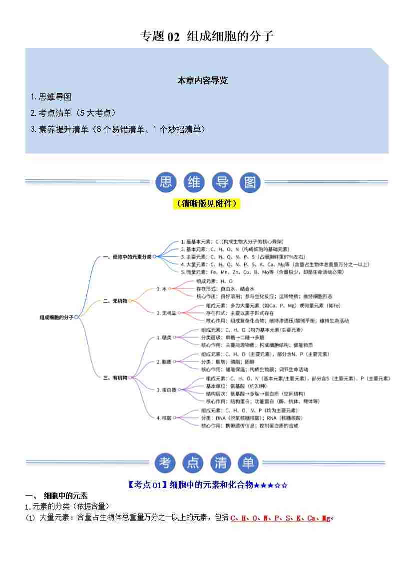 专题02(知识清单) 组成细胞的分子(期末知识清单)