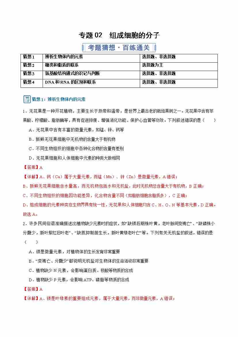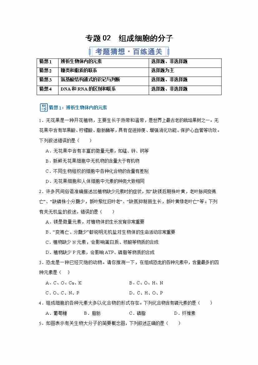 专题02(考题猜想) 组成细胞的分子(期末专项训练)(解析版)