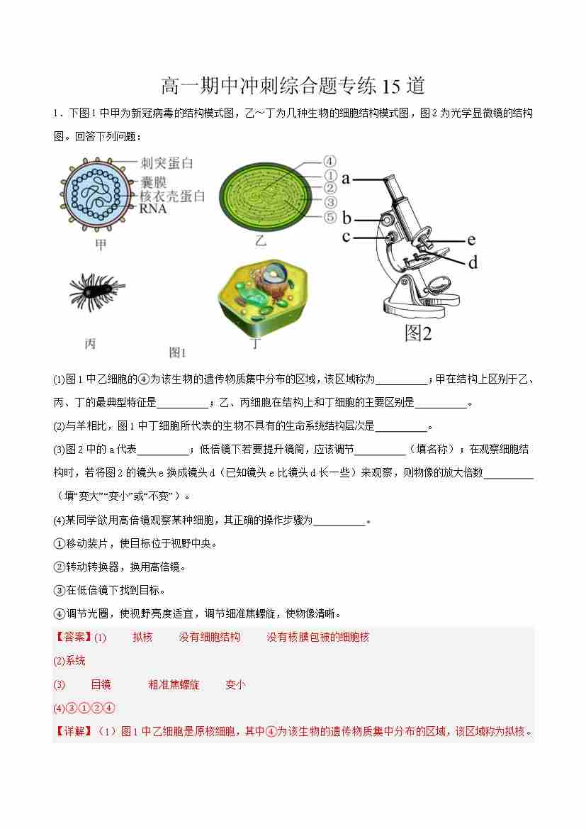 第1章 走近细胞(单元测试·提升卷)(教师版)