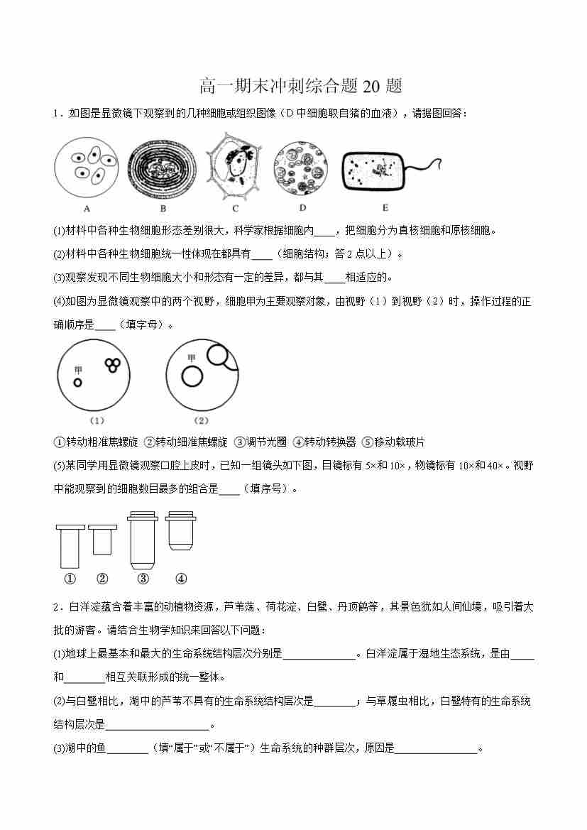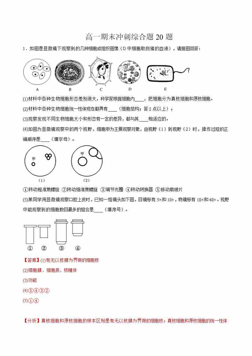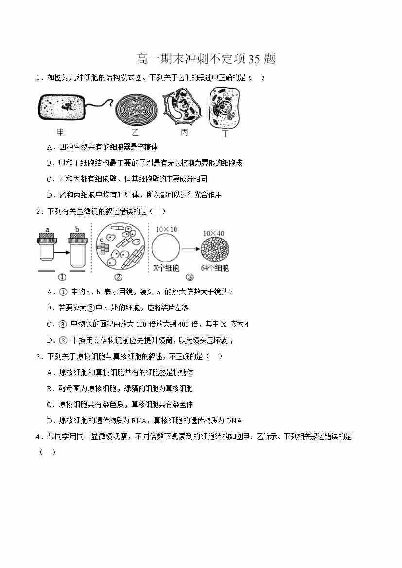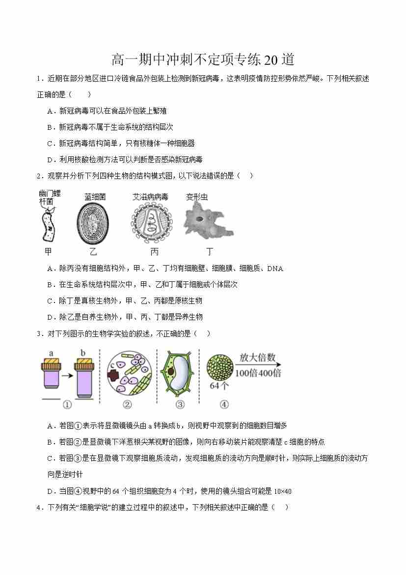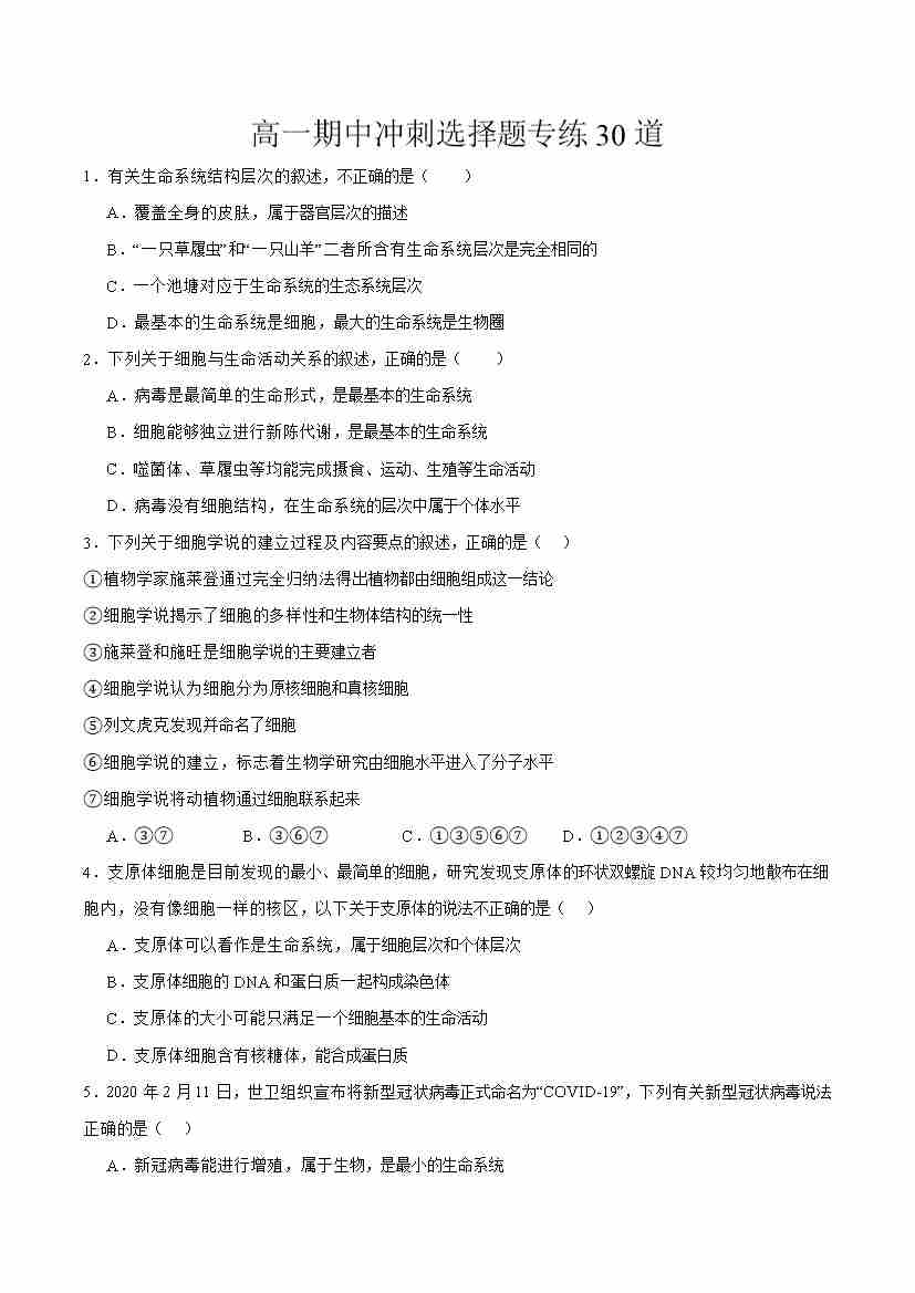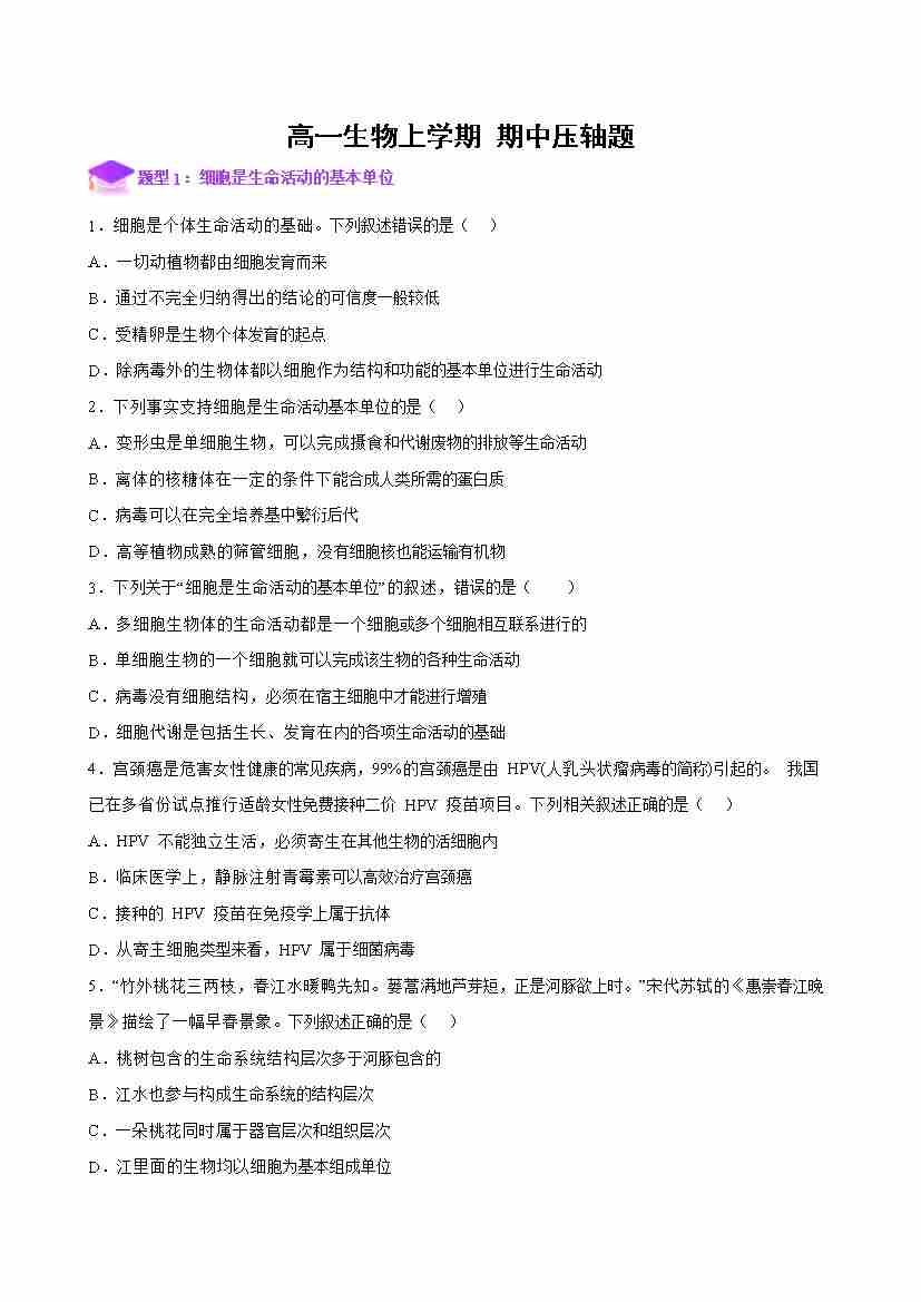 高一生物上学期期中压轴题专练(学生版)