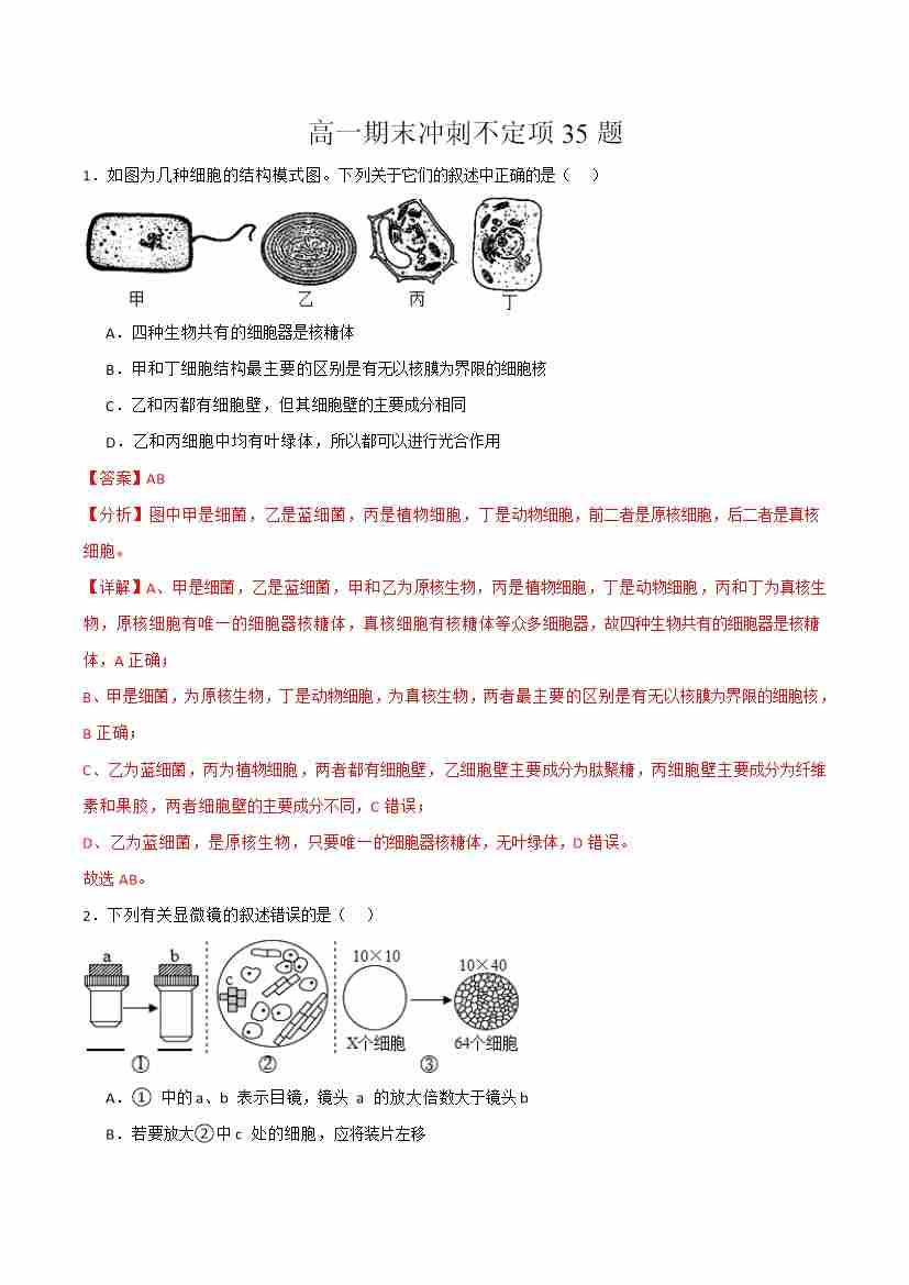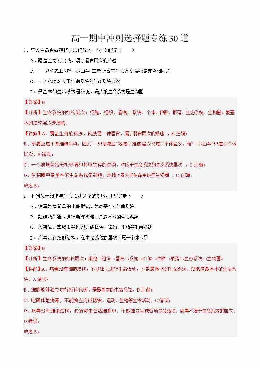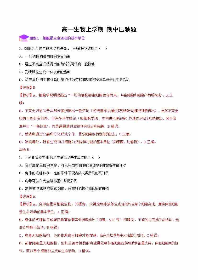 高一生物上学期期中压轴题专练(教师版)