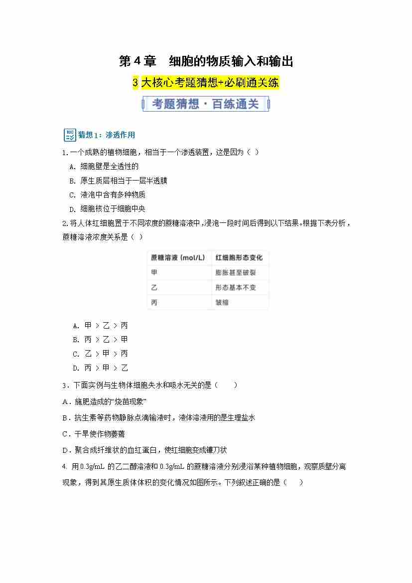 第4章 细胞的物质输入和输出(期中专项训练)(学生版)