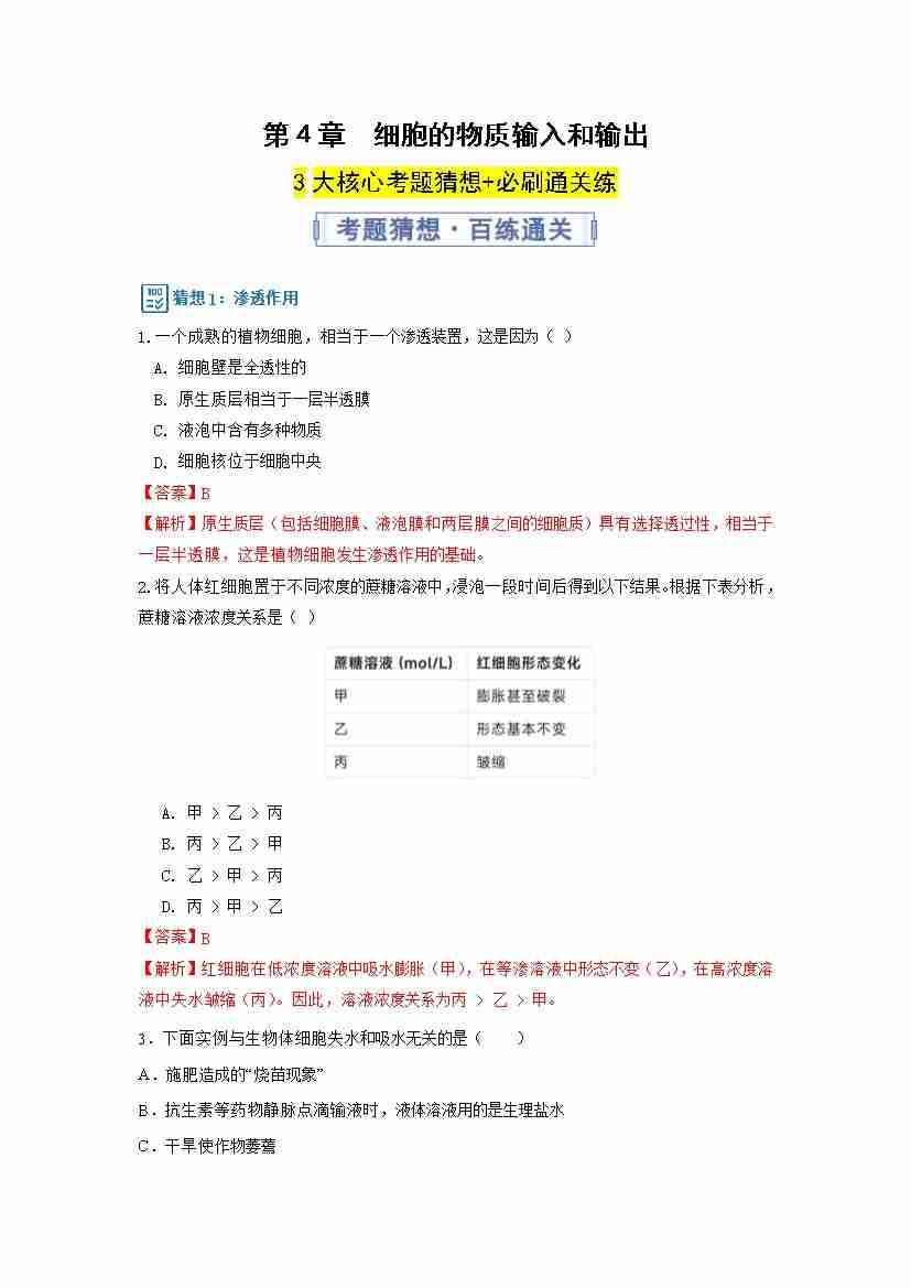 第4章 细胞的物质输入和输出(期中专项训练)(教师版)