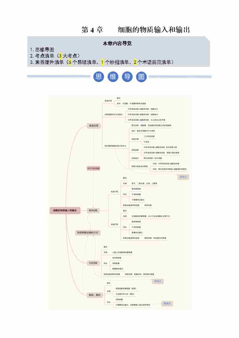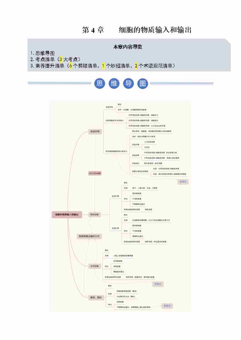 第4章 细胞的物质输入和输出(期中知识清单)(学生版)