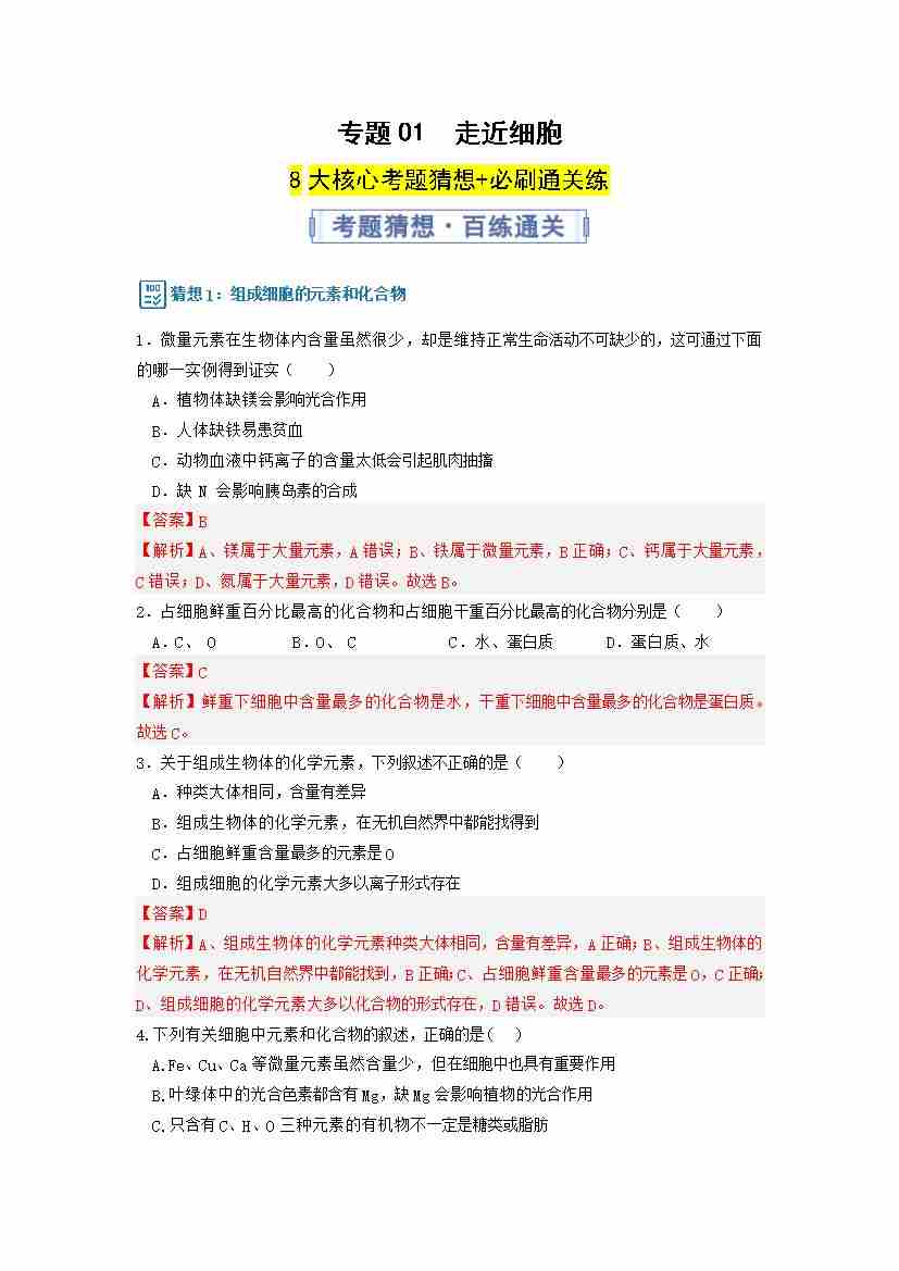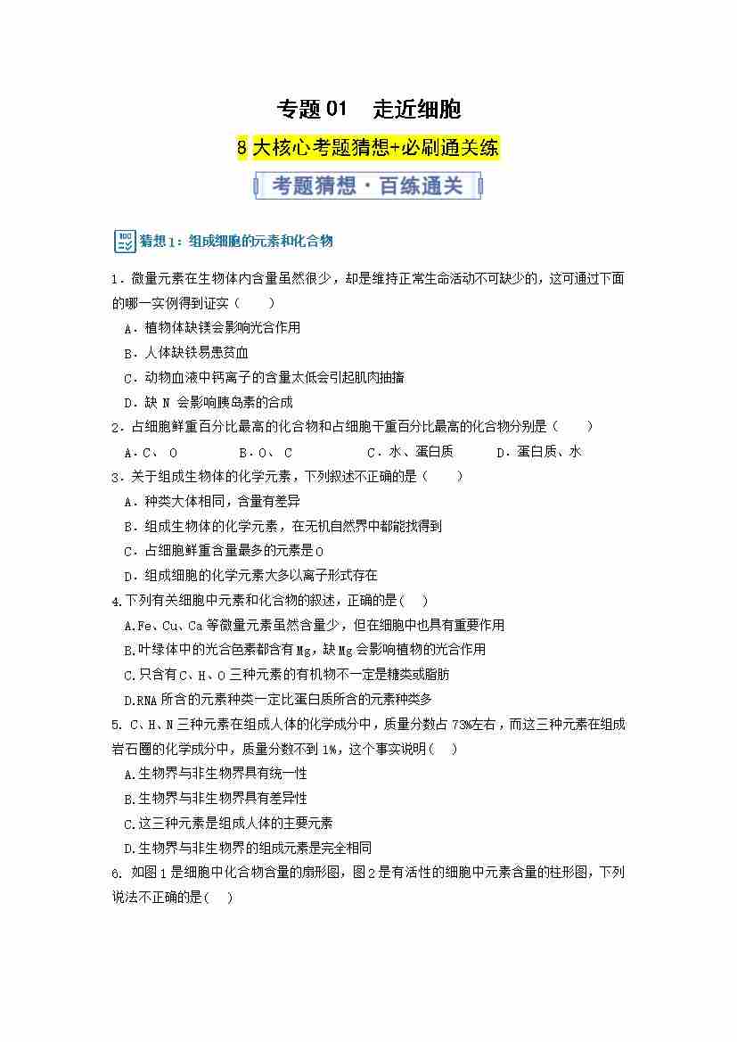 第二章 组成细胞的分子(期中专项训练)(学生版)docx