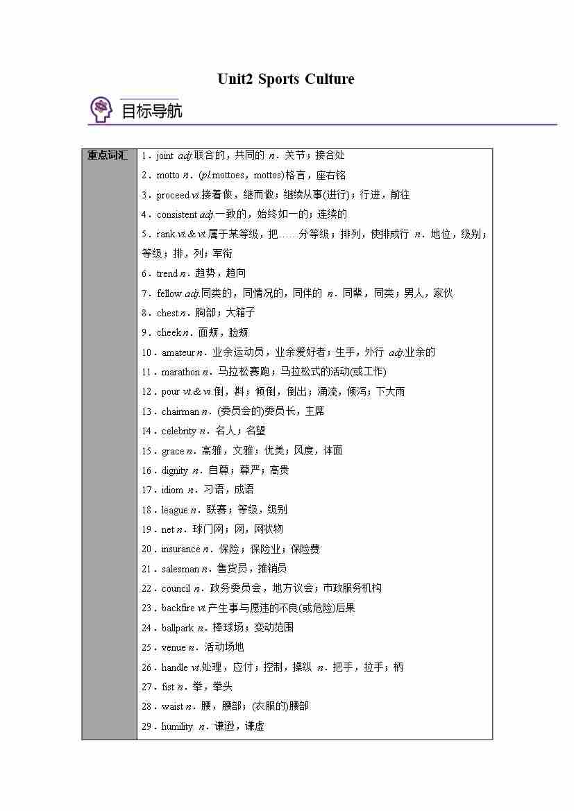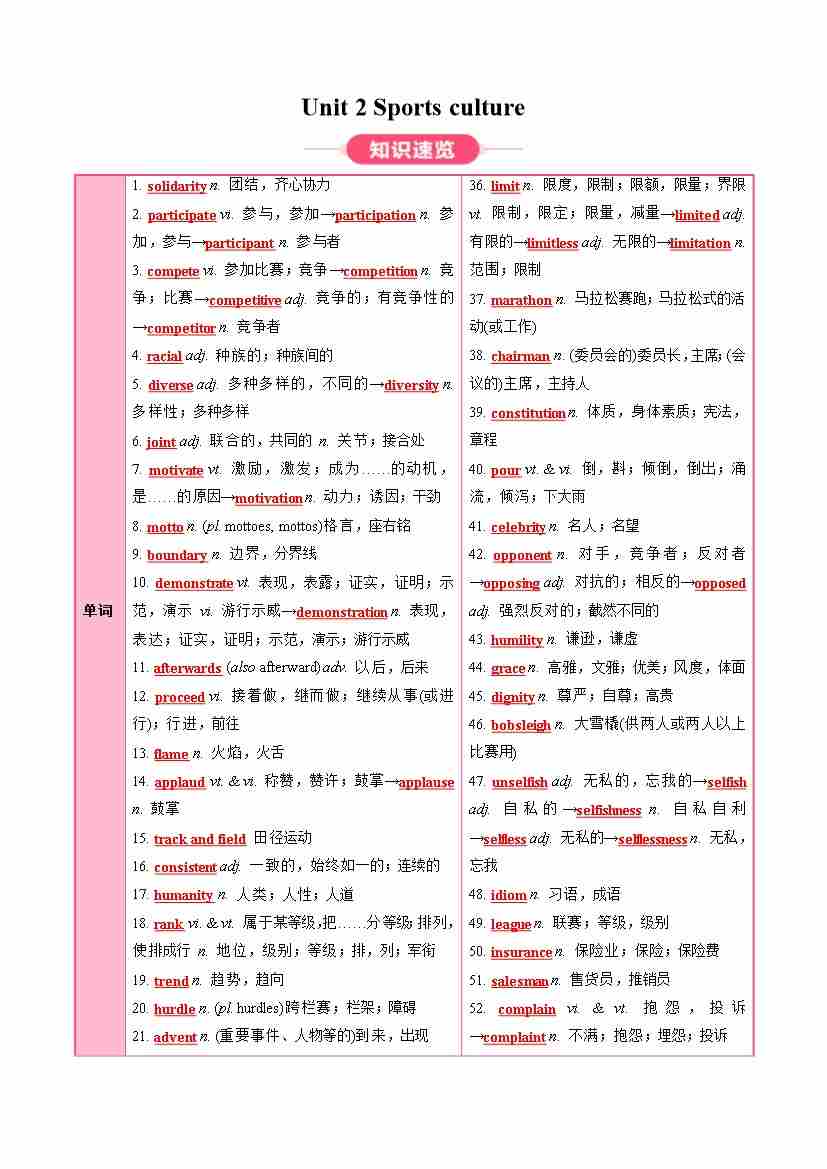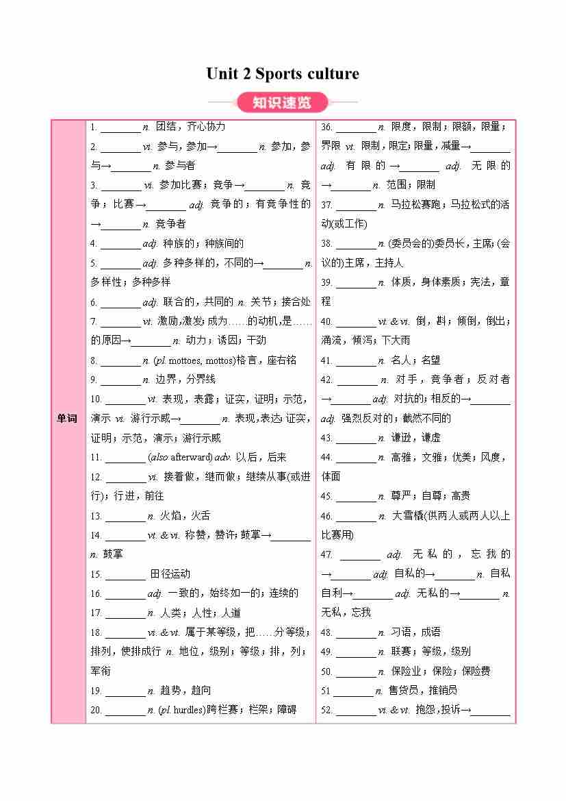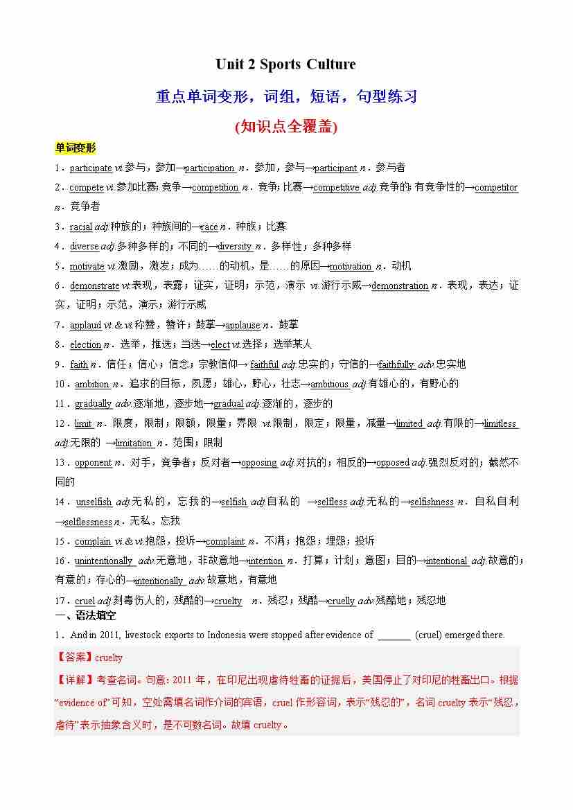 Unit 2 Sports Culture词性转换,核心单词,语法,短语,知识点复习题(教师版)
