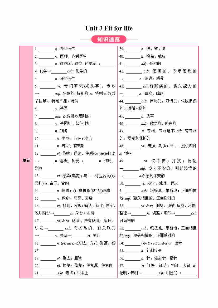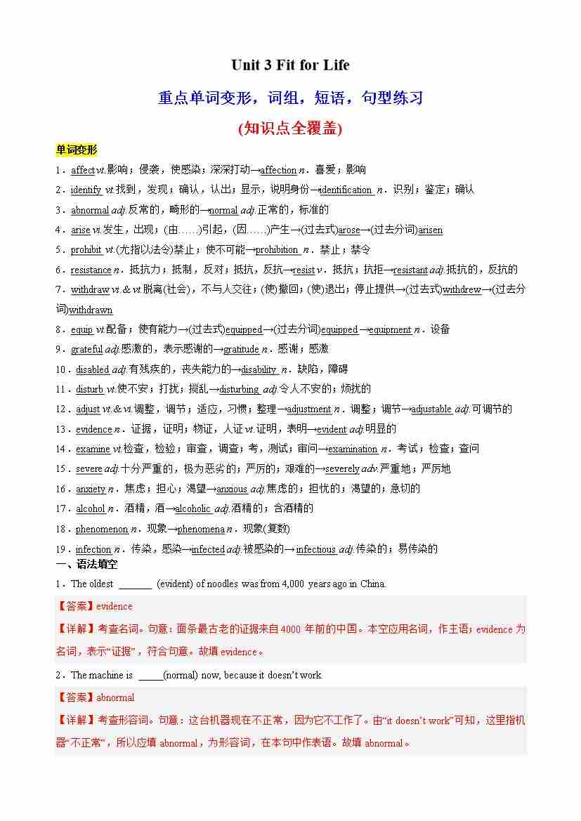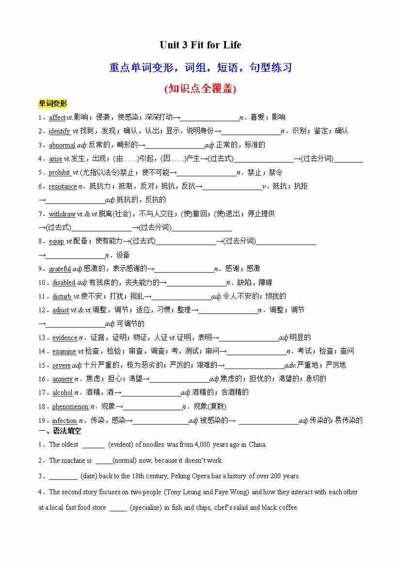 Unit 3 Fit for Life词性转换,核心单词,语法,短语,知识点复习题(教师版)