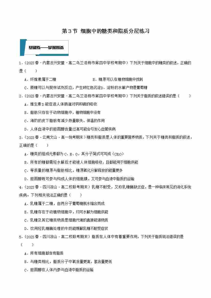 2.3 细胞中的糖类和脂质(原卷版)
