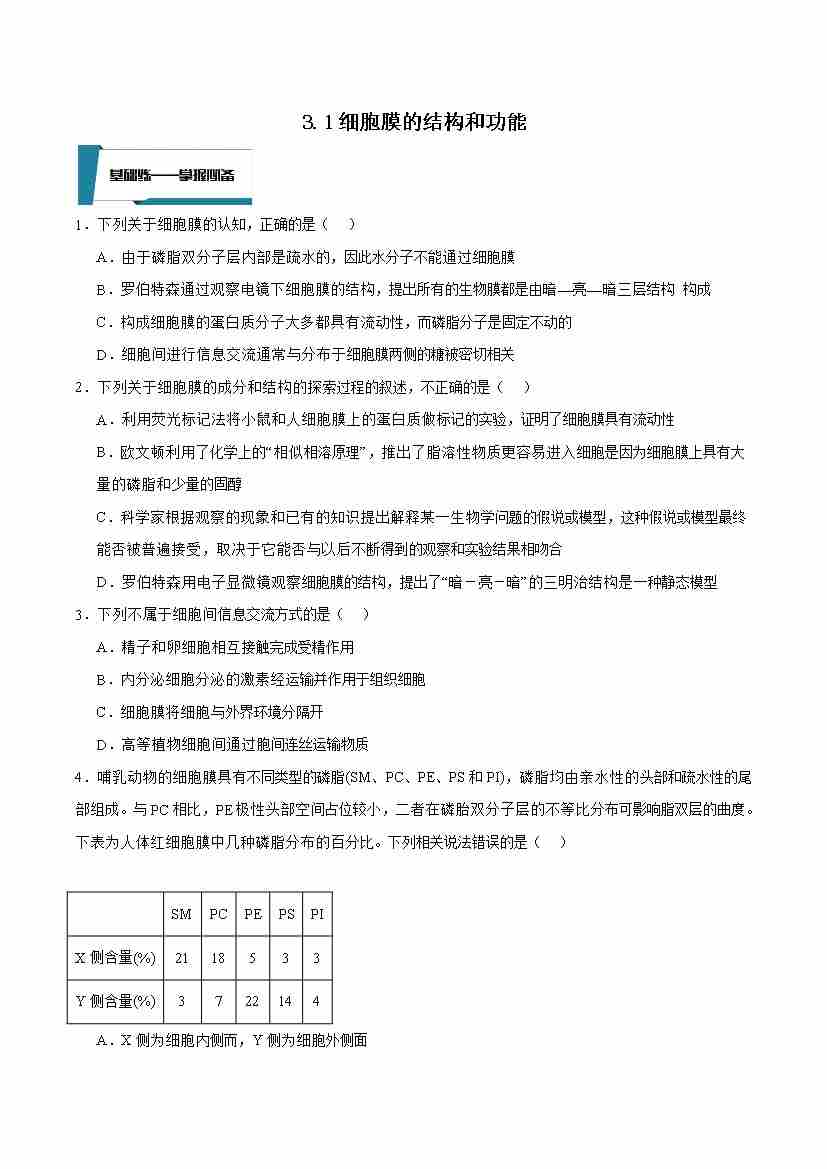 3.1 细胞膜的结构和功能(原卷版)