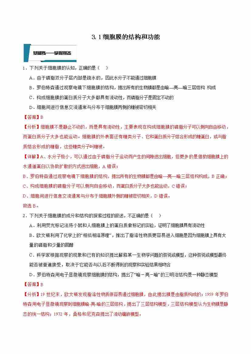 3.1 细胞膜的结构和功能(解析版)