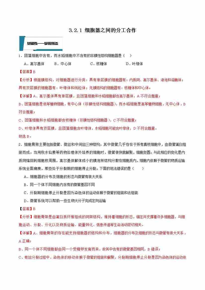 3.2.1 细胞器之间的分工合作(解析版)
