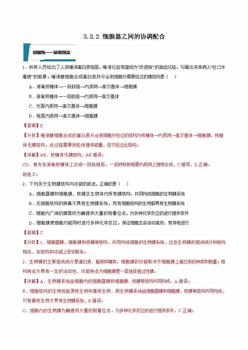 3.2.2 细胞器之间的协调配合(解析版)